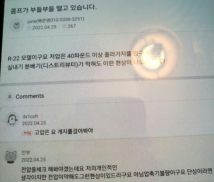 ● 가끔 저압전력//under voltage의 경우, 콤푸 가동이 쉽지 않아 , 콤푸 전체가 흔들리는 경우 (?)// 부들부들 흔들리는듯한 현상이 발행되는 경우.