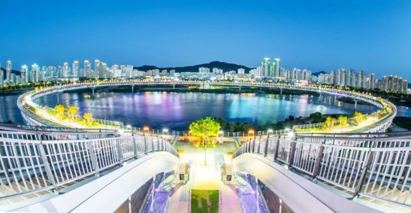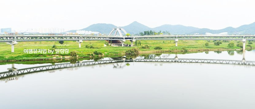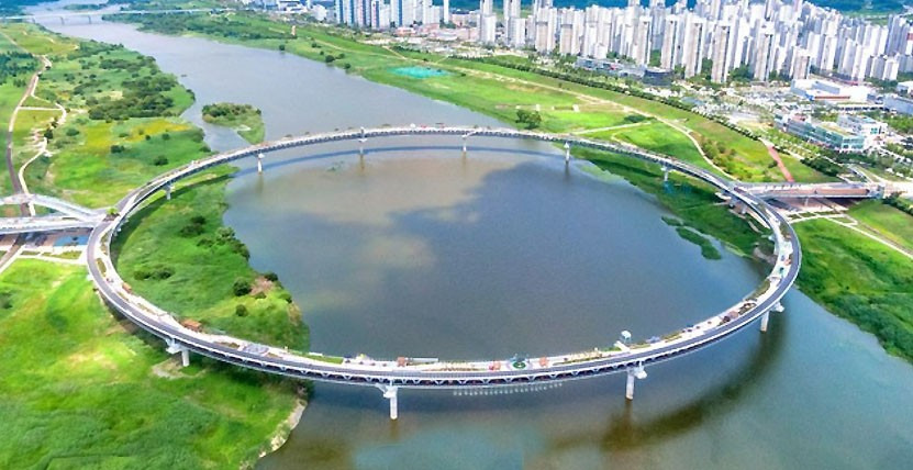 모양도 한글 'o' 으로 만들었습니다 길이가 국내에서는 가장 긴 ~ 보행교. 상부는 보행로, 하부는 자전거 전용도로로 되어 있습니다