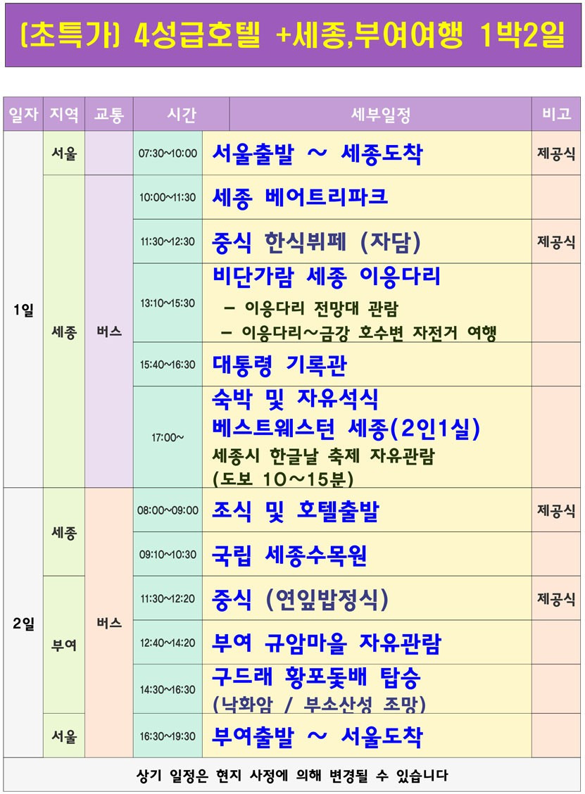 위 모든 일정은 당일 여행지 상황, 도로, 날씨, 여러상황에 따라 일정 일부가 변경될 수도 있습니다