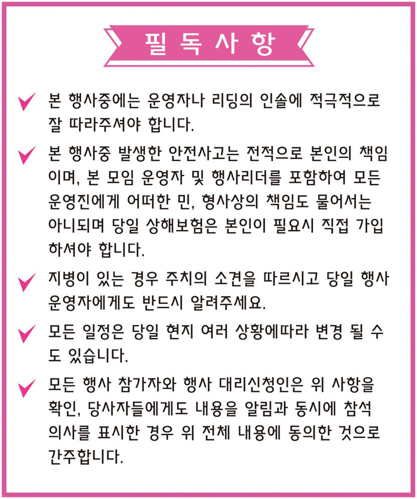 3. 위 여행 전체 일정 체력에 무리가 있으신 분들은 참석불가하며 전체 일정대로 함께 해 주셔야합니다.