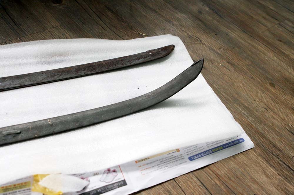 사진의 앞쪽에 있는 도신이 열처리를 한 상태의 도신입니다.