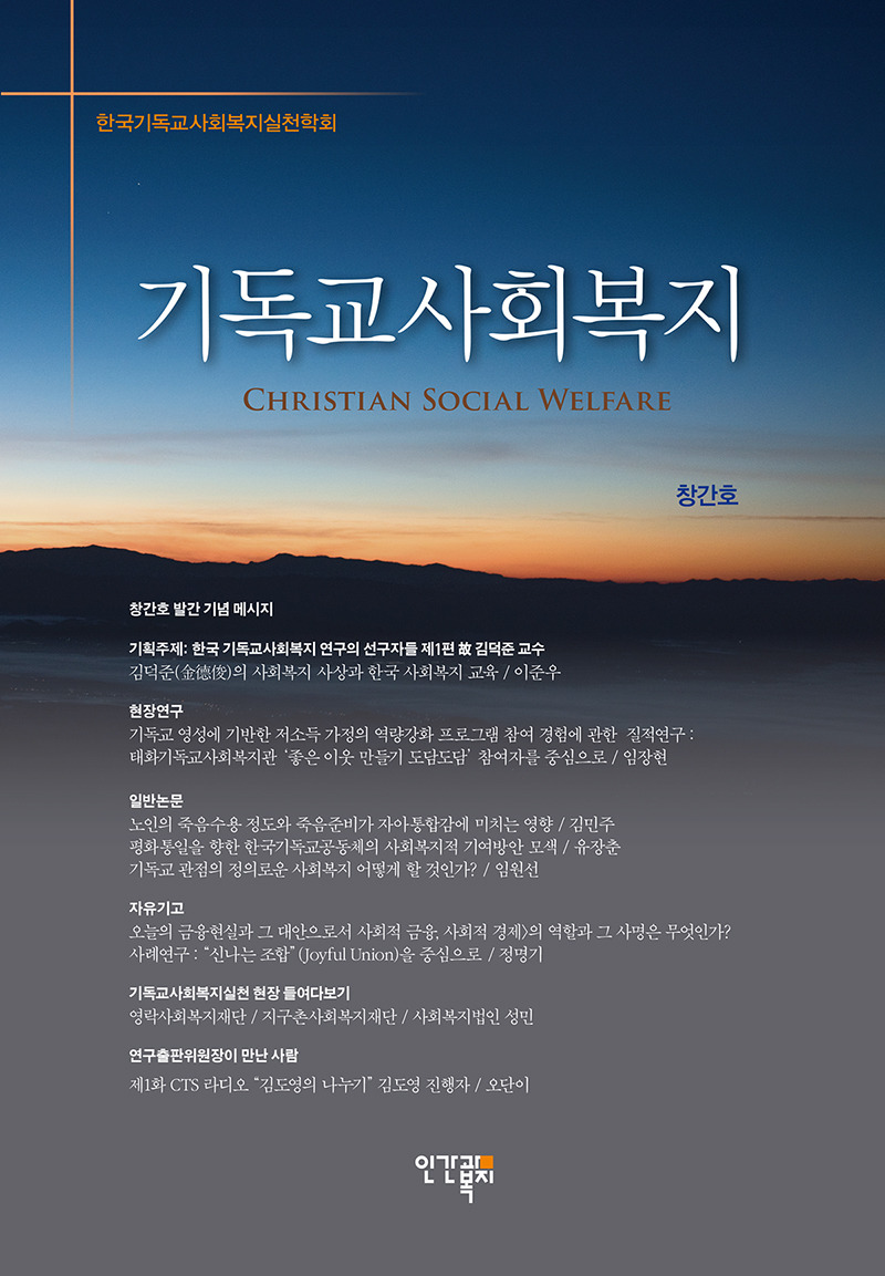 이 책은 기독교 정신으로 사회복지를 실천하고자하는 이들을 위해 기획되었다. 따라서 전통적 연구 집필 수준을 담보하면서 정형화된 틀을 뛰어넘어 실천현장의 다양한 목소리를 묶어내는 학술지로 세상에 나오게 되었다. 즉, 자유로운 형태의 학술적 성과들을 공유하면서 자율과 융합, 소통과 활발한 토론 등이 ‘콜라보레이션’되는 혁신적인 편집을 실험하였다. 지금까지 교회와 신학은 ‘사회선교’에 대한 많은 신학적 이론을 제기해 왔다. 그러나 신학자들의 기독교사회복지에 대한 해석이 오늘날 한국 교회가 한국 사회를 향한 사회선교에서 비효율적이고 부정적인 결과를 초래하여, 교회에 대한 한국 사회의 신뢰가 추락한 것이 사실이다. 창간호 발간 기념 메시지 학회장의 글 기획주제: 한국 기독교사회복지 연구의 선구자들 제1편 故 김덕준 교수 현장연구 일반논문 자유기고