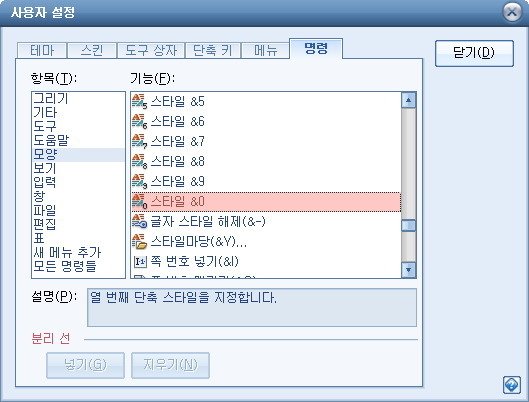 단축키를 사용하거나, 도구-사용자 설정의 명령 칸에서 명령을 찾아 도구상자에 꺼내서 사용할 수 있습니다.