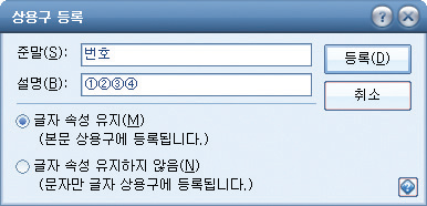 2) [상용구 등록] 대화상자가 나오면 준말에‘번호’라고 입력하고 <등록> 단추를 클릭합니다.