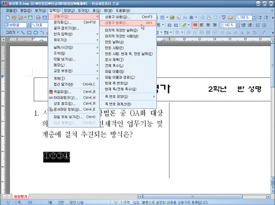 시험지를 편집하려면 ①,②,③,④ 와 같은 원문자를 자주 입력해야 하는데, 매번 문자표를 사용해서 하나씩 불러오려면 번거롭습니다. 이런 경우에는 상용구를 사용하면 쉽게 입력할 수 있습니다. 상용구는 글자, 표, 글상자, 그림 등 모든 개체들을 등록하여 언제든지 불러올 수 있습니다. | ||