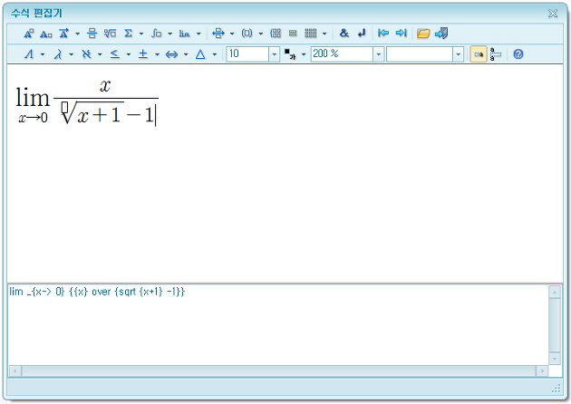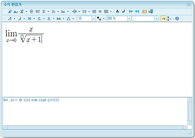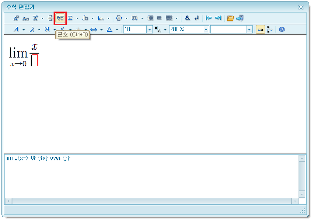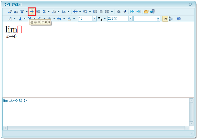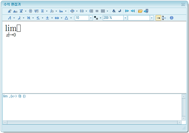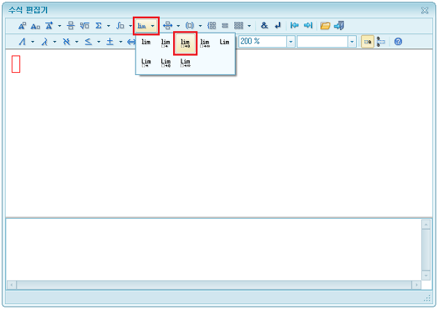 [수식 편집기] 창이 나타나면 아래에 붉게 표시한 [극한]을 눌러 세부 항목을 선택한다.