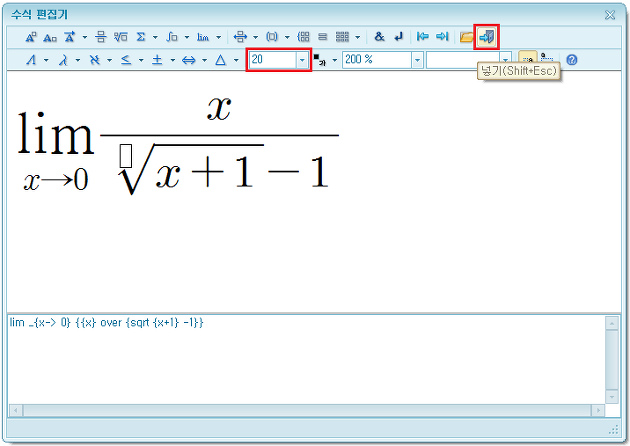 수식 편집기에서 작성된 수식을 문서 안으로 삽입하면 크기를 조절할 수 없게 된다. 크기를 적당히 조절한다. 완성된 수식을 문서에 삽입하기 위하여 [넣기]를 누른다.
