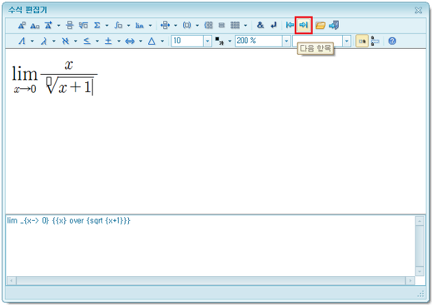 수식 입력을 마친 후 근호 밖의 수식을 입력하기 위하여 아래 붉게 표시된 [다음 항목]을 누른다.