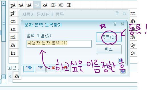 클릭 후 '영역 이름(N)' 밑의 '사용자 문자 영역(1)'을 지우고 하고 싶은 이름을 정한 뒤 옆에 있는 '등록'을 누릅니다.