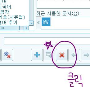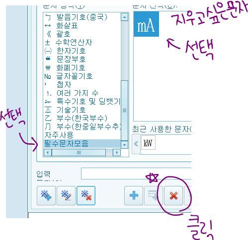 위의 그림처럼 'kW'를 선택 후 아래의 엑스모양 아이콘을 누르시면 됩니다. (꼭 '최근 사용한 문자' 공간에 있는 'kW'를 눌러야 합니다. '단위기호'에 있는 'kW'를 누르면 아예 'kW' 기호가 목록에서 사라집니다.)
