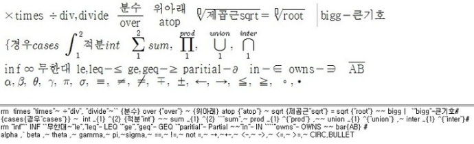 TIMES 곱하기, OVER 분수, ATOP 위아래, SQRT 제곱근, BIGG 기호-가운데 큰 기호