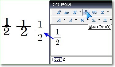 완성된 모양은 편집창에 나타나는 걸로 확인합니다. 예를 들어 분수 같은 경우 1 over 2 이렇게 글자를 쓰면