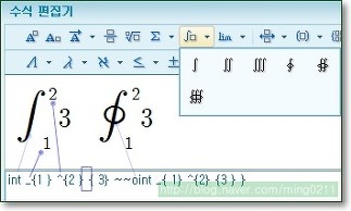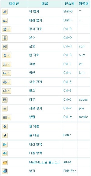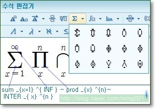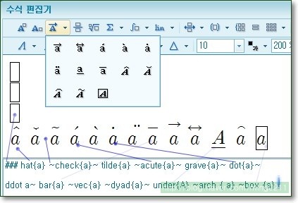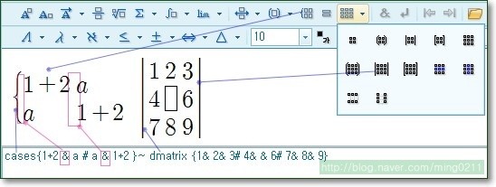 - 몇몇 명령(첨자같은)은 편집창에 입력해도 바로 적용 되는데, 입력할땐 내가 치는 내용은 보이지 않고 결과만 나옵니다. 물론 입력창에는 치는 내용이 나옵니다만, 커서가 따라붙지 않아서 그런가 답답해서 저는 잘 안씁니다. 초보자는 이 편집창을 이용하는 게 더 쉬울것 같아요.