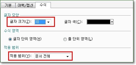 수식의 글자크기는 보통 10으로 지정되어 있는데요. 글자크기를 바꾸려면 수식편집기를 사용할때 말고는, 이 수식속성의 수식에서 밖에 고칠 수 없습니다. 그대신 범위를 문서전체로하면 한꺼번에 문서의 수식크기를 다 바꿀 수 있죠... 글자색도.. 여기 수식영역을 줄단위로 하면, 배치의 자리차지와 같이 한줄 전체를 수식으로 넣을 수 있습니다.