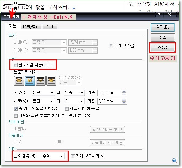 수식은 원래 글자처럼 취급으로 되어 있습니다. 그래서 글자 중간에 개체가 자연스럽게 들어가는 것이죠. 하지만 한 줄 전체를 차지하고 싶다던가, 다른 배치모양으로 하려면 글자취급을 취소하고 아래의 배치중 지정합니다.