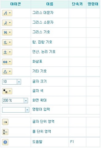 아래 기호들은 편집창에서는 나타나지 않습니다.(명령어, 아이콘등은 저~아래 그림을 참고하시고,