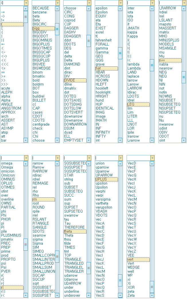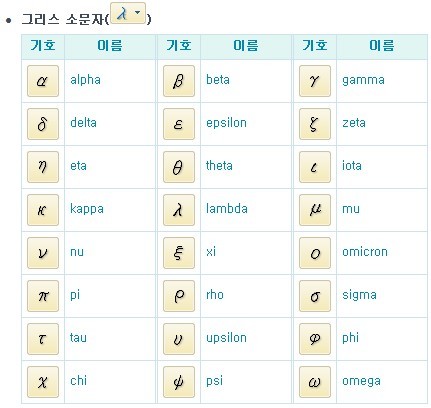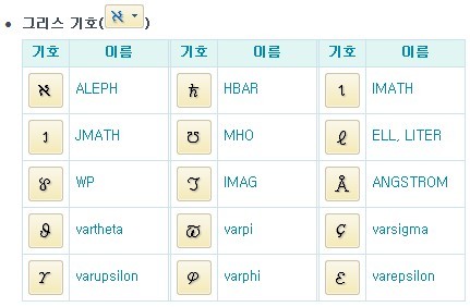 수식에는 명령어 말고도 수없이 많은 기호들도 있죠. alpha, theta, beta, gamma, mu, pi 이런것들도 입력창에서는 모두 텍스트로 입력합니다. 아래처럼 기호의 이름을 직접 입력해주면 됩니다. 하지만, 이걸 다 외울수는 없는 노릇이죠. 대부분은 도구의 기호로 표시되어 있으니 기호를 입력할땐 도구 아이콘을 찾아보면 됩니다. 또 없는것은 Ctrl+F10 문자표를 이용하면 되구요.. 주로 유니코드 수학연산자 중에서 찾는 경우가 많습니다.