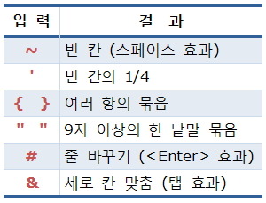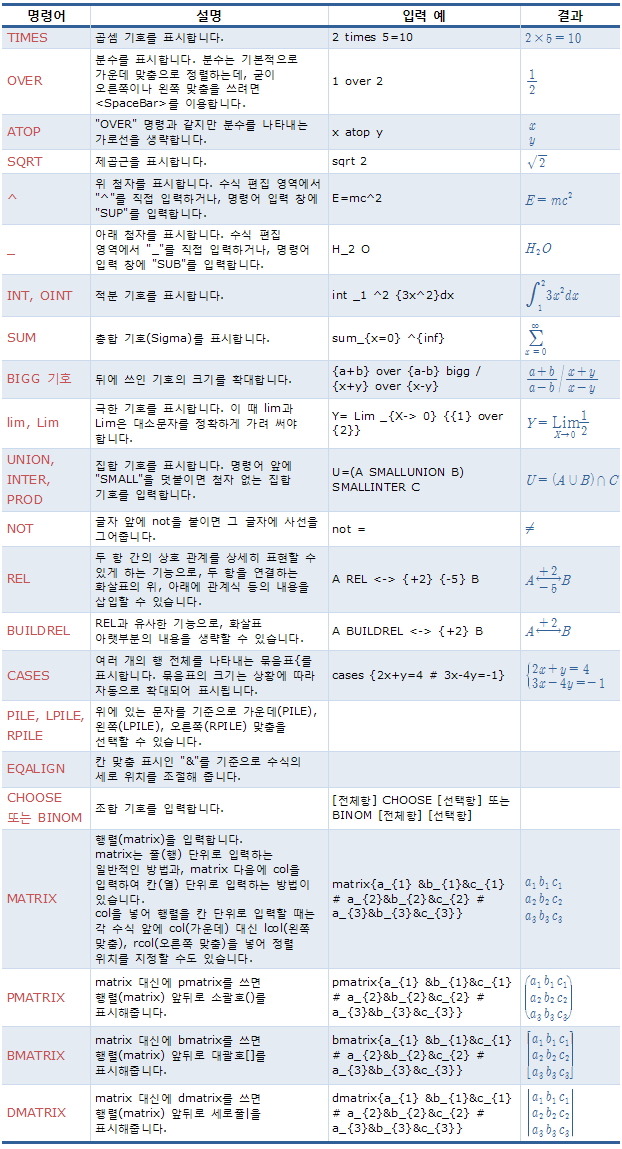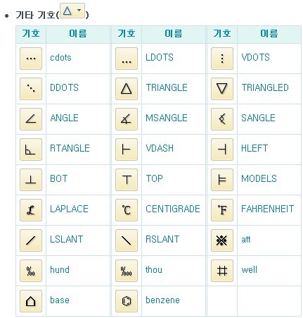 이 기호들은 입력창에 입력해도 편집창에는 표시되지 않습니다. 몇가지 안되지만 수식의 모양을 결정하는 기호이니, 최소한 이건 꼭 알고 있어야 한글 수식을 제대로 입력할 수 있습니다~