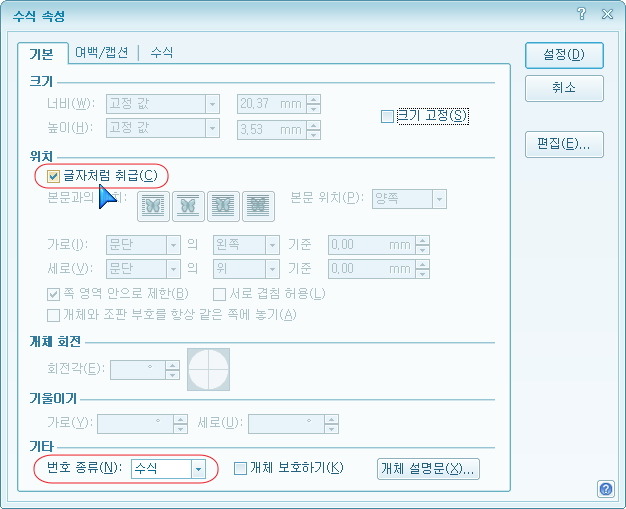 수식도 개체라 다른 개체처럼 개체속성 창을 씁니다. 우클릭 개체속성으로 들어가도 되고, 선택 -> P 나 Ctrl+N,K 고치기로 들어가도 됩니다. 수식은 기본 글자처럼 취급(글자 단위 영역)으로 배치되고, 수식 캡션번호와 조판부호를 가지고 있습니다. 그러니까 문서에 수식을 찾아보려면 조판부호를 키고 보거나, Alt+G 조판부호 찾기를 해서 Ctrl+L, Ctrl+Q,L로 찾을 수 있습니다.