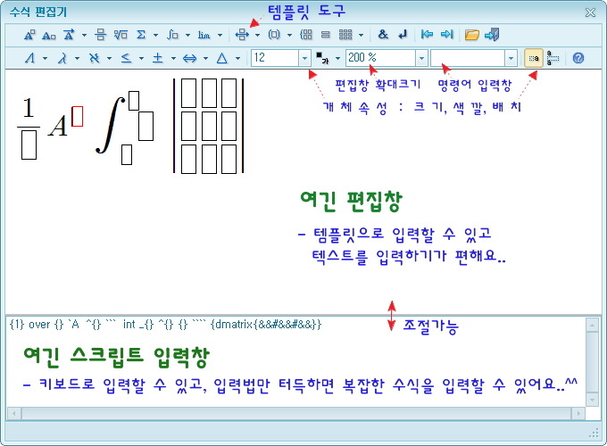 그래서 수식편집기는 기본적으로 편집창이 아닌 입력창에 입력하도록 되어 있습니다.2 편집창은 보통 초보자들이 간단한 수식을 쓰거나 결과를 보는 창으로 쓰이게 됩니다. 하지만, 입력창을 쓰려면 기본적으로 알아야 하는 것들이 있는데요.. 입력방법이 특이하기 때문에 첨엔 좀 불편할 수 있어요. 그래도 최소한의 입력기호를 알고있다면 명령어와 함수등은 도구를 이용하면 되니까요. 입력창으로 빠르고 완벽하게 수식을 완성해 보시기 바랍니다. 아래한글의 모든 명령이 그렇듯.. 수식은 참 완성하는 재미가 있는것 같아요..^^