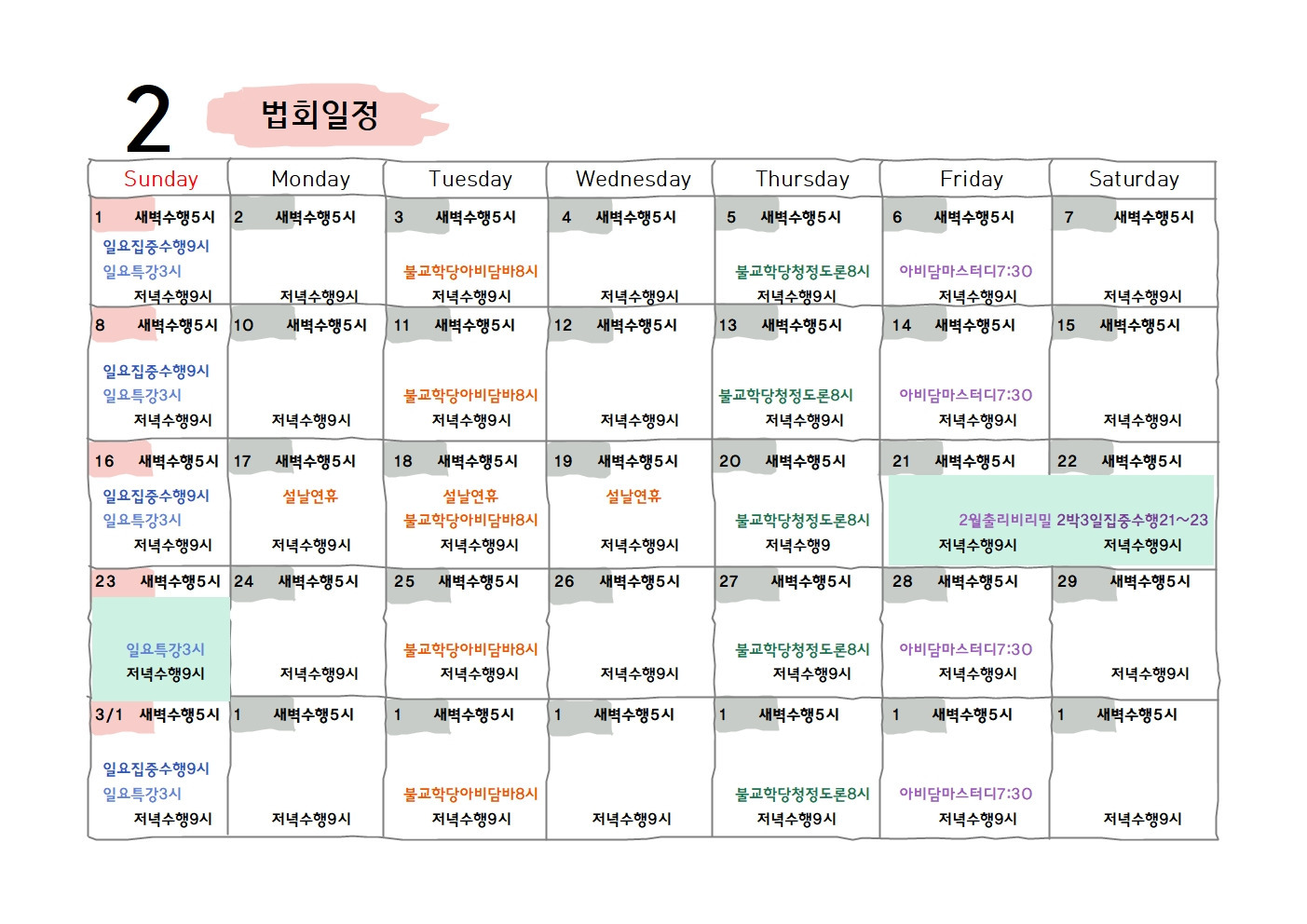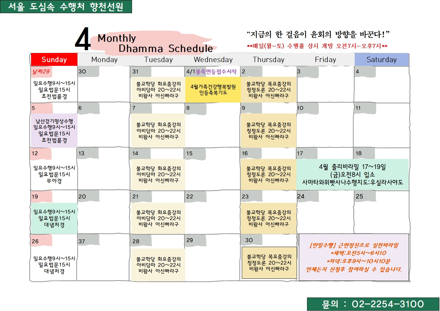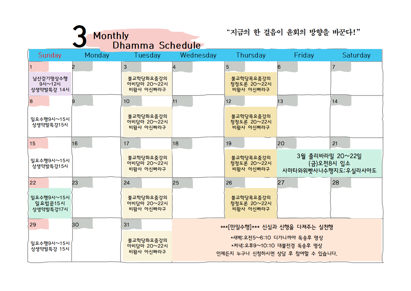 2026년4월 [일요집중수행및 법회] 안내 작성자까페지기|작성시간26.01.01|조회수316 목록 댓글 0 글자크기 작게가 글자크기 크게가 2025.8월~2026.1월 특강2026.3월특강2026.불교학당틱낫한영어법회강좌_강사 아비다야생생약발강좌_강사 수카위하리화요_아비담마 강사 아신 빠라구스님목요_청정도론 강사 아신 빠라구스님 다음검색 현재 게시글 추가 기능 열기 북마크 공유하기 신고 센터로 신고 댓글 댓글 0 댓글쓰기 답글쓰기 댓글 리스트