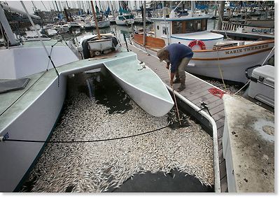 산타 크루즈의 자원 봉사 벤로드 먼은 산타 크루즈, 캘리포니아., 2014년 8월 1일 (금요일)에있는 산타 크루즈 작은 공예 항구에서 물을 범람 한 생명이 멸치의 수천의 일부를 정리 곳 물고기 다이 오프는 수요일 밤에 발생했습니다. 대규모 정리가 일어나고 및 자원 봉사자의 노력으로 도움을 요청하고 있습니다. 보텔은 분해 물고기가 항구에서 보트의 선체에 보호 페인트를 망칠 것이라고 말한다.