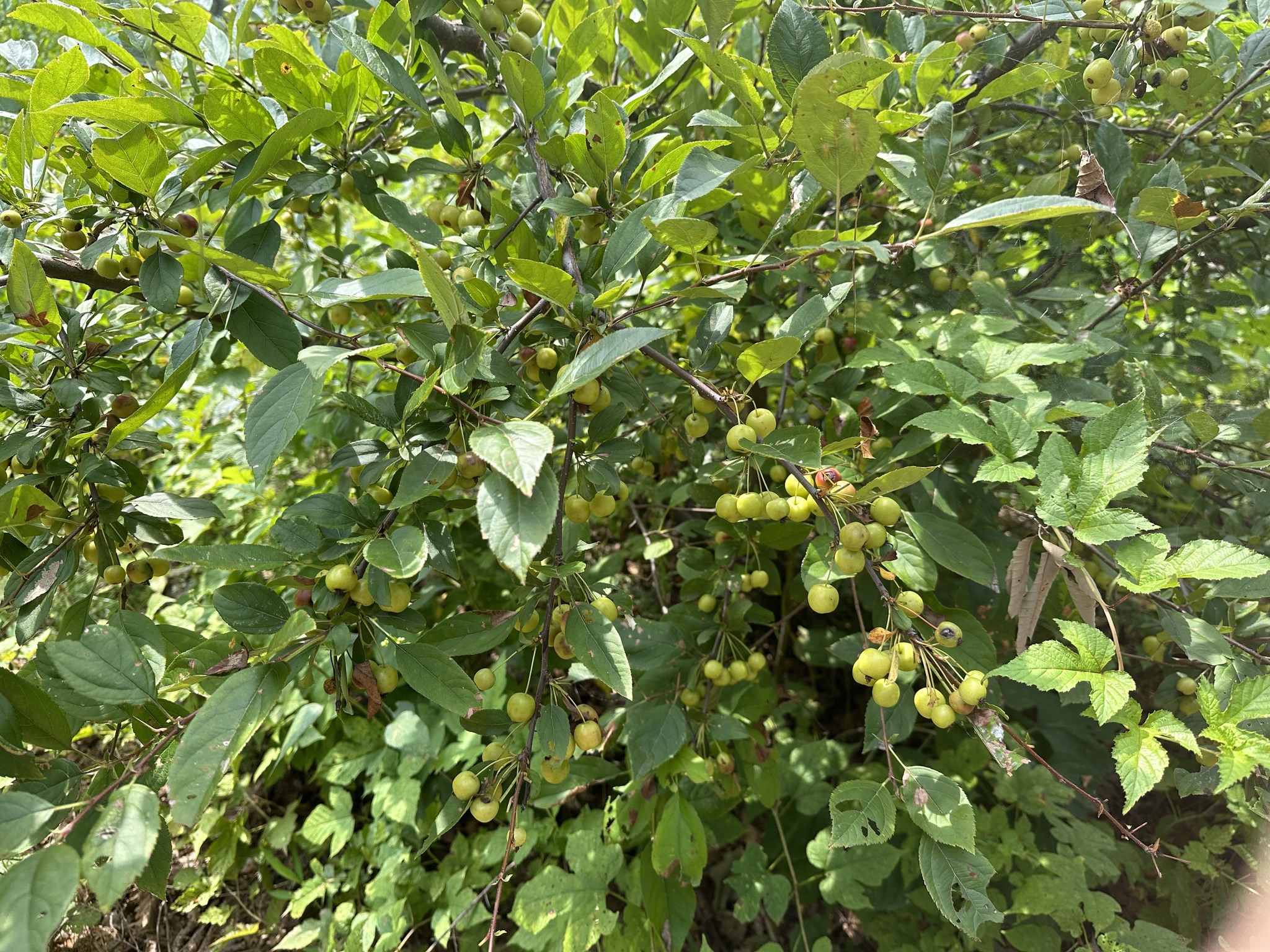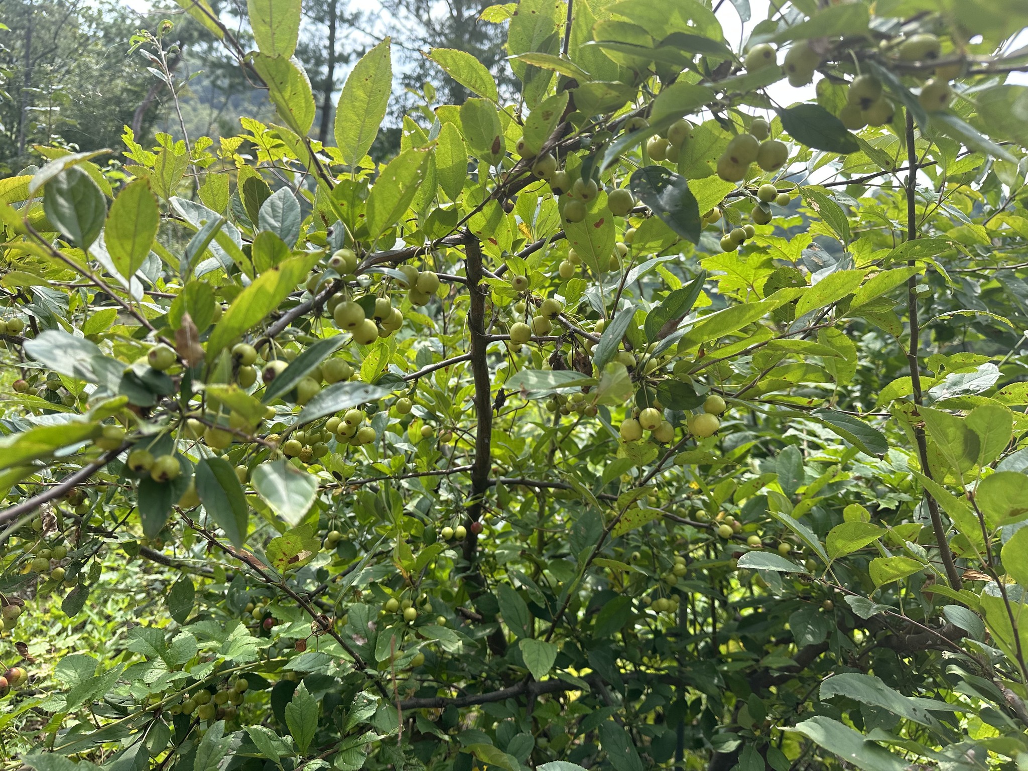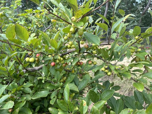 자연농 혜림원에는 농장 설립초기에 심은 사과나무가 2,000주였으나 지금까지 성공적으로 살아남은 것이 약 1,500주에 이른다. 여기에 추가해서 9년전에 능금나무 10주를 더 심었으나 지금까지 4주만이 살아남았다. 농장의 김주진 대표도 이 능금나무가 사과나무의 일종으로 알고 심었다고 한다. 이 나무들 중 한 나무에서만 작년부터 꽃이 피기 시작하더니 열매까지 맺었다. 그런데 능금이 옛날 사과와 거의 동이어로 불렸던 기억이 있어서 보통의 사과형태를 기대했으나 아마도 수많은 사과 종류의 하나로 좀 특이한 종의 사과인 것 같다. 작년에도 그랬지만, 금년의 능금을 맛보니(2023-08-21) 사과 맛은 분명 나는 것 같은데 크기가 어린이들의 작은 알사탕 정도 밖에 되지 않는다. 더 이상 커지지는 않을 것 같다.