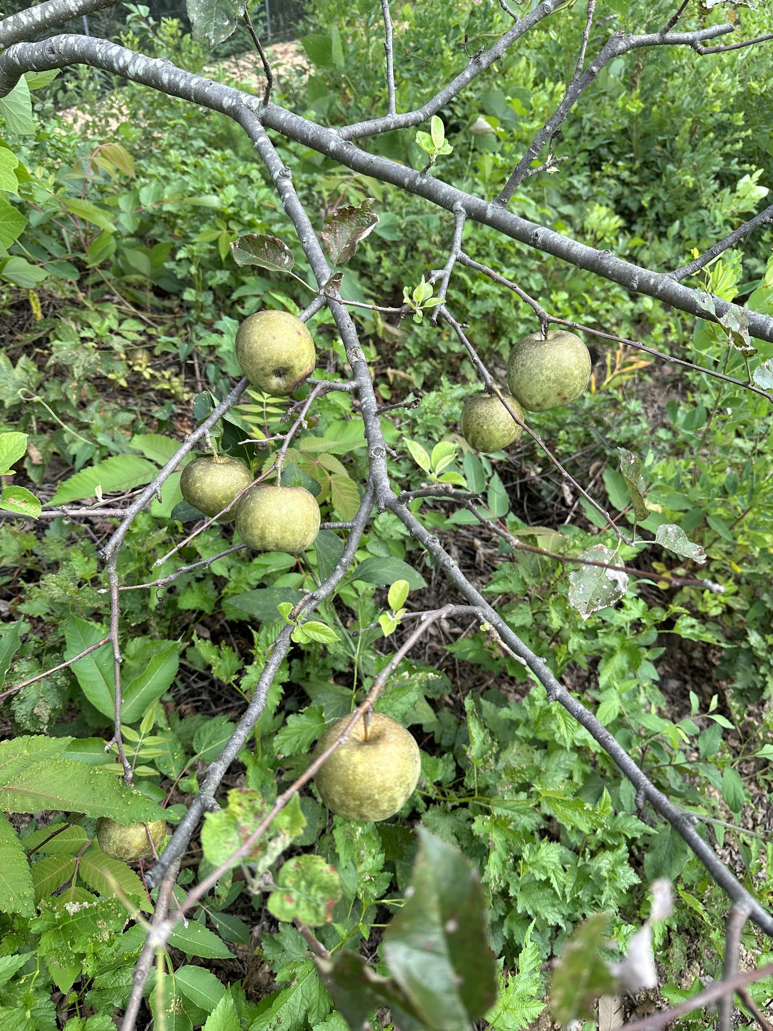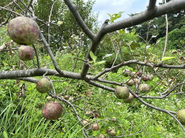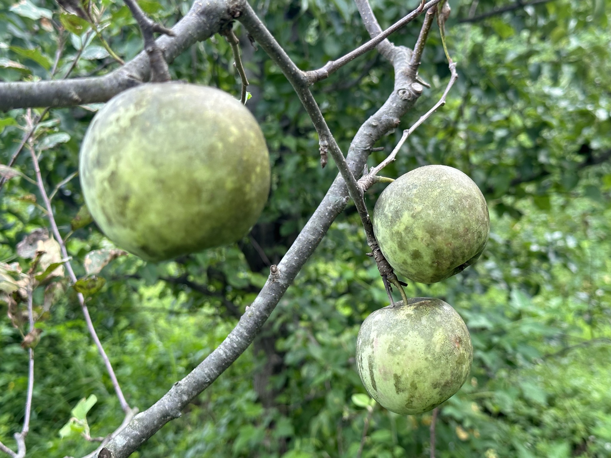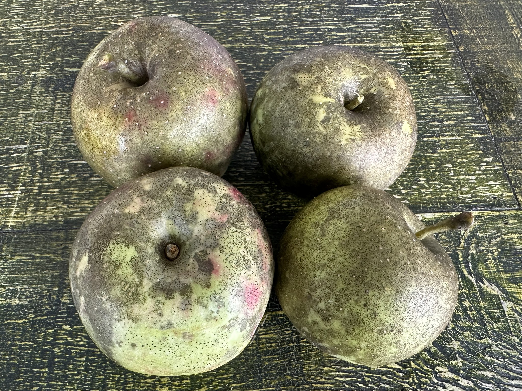 사진에서 잘 나타나고 있는 바와 같이 사과알의 표면은 온통 그을음으로 덮였다. 더러는 이것을 두고 ‘그을음병’이라고도 하지만, 나는 그것을 일종의 ‘병(病)’으로 간주하는 것은 잘못이라고 생각하고 싶다. 일단 그런 사과를 깍아보면 알맹이는 말짱하다. 그것이 병이라면 속의 과육까지 영향이 있을 것이지만, 그런 것 같지는 않다. 그러기에 식초를 담는 데에는 아무 지장이 없다고 생각한다. 나는 이런 그을음이 아직은 자연농의 연륜이 짧아서 사과나무가 그 자체로 외부로부터 알맹이를 보호하기 위한 ‘생존전략’에서 이런 현상이 일어나는 것으로 보고 싶다.