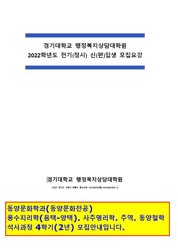 경기대학교 행정사회복지대학원 동양문화학과(풍수지리학, 명리학, 풍수, 관상, 주음양오행론, 동양철학 중심의 교과 과정) 석사과정(4학기) 2022년 전기 신(편)입생을 아래와 같이 모집하기에 정보를 공유하고자 합니다.