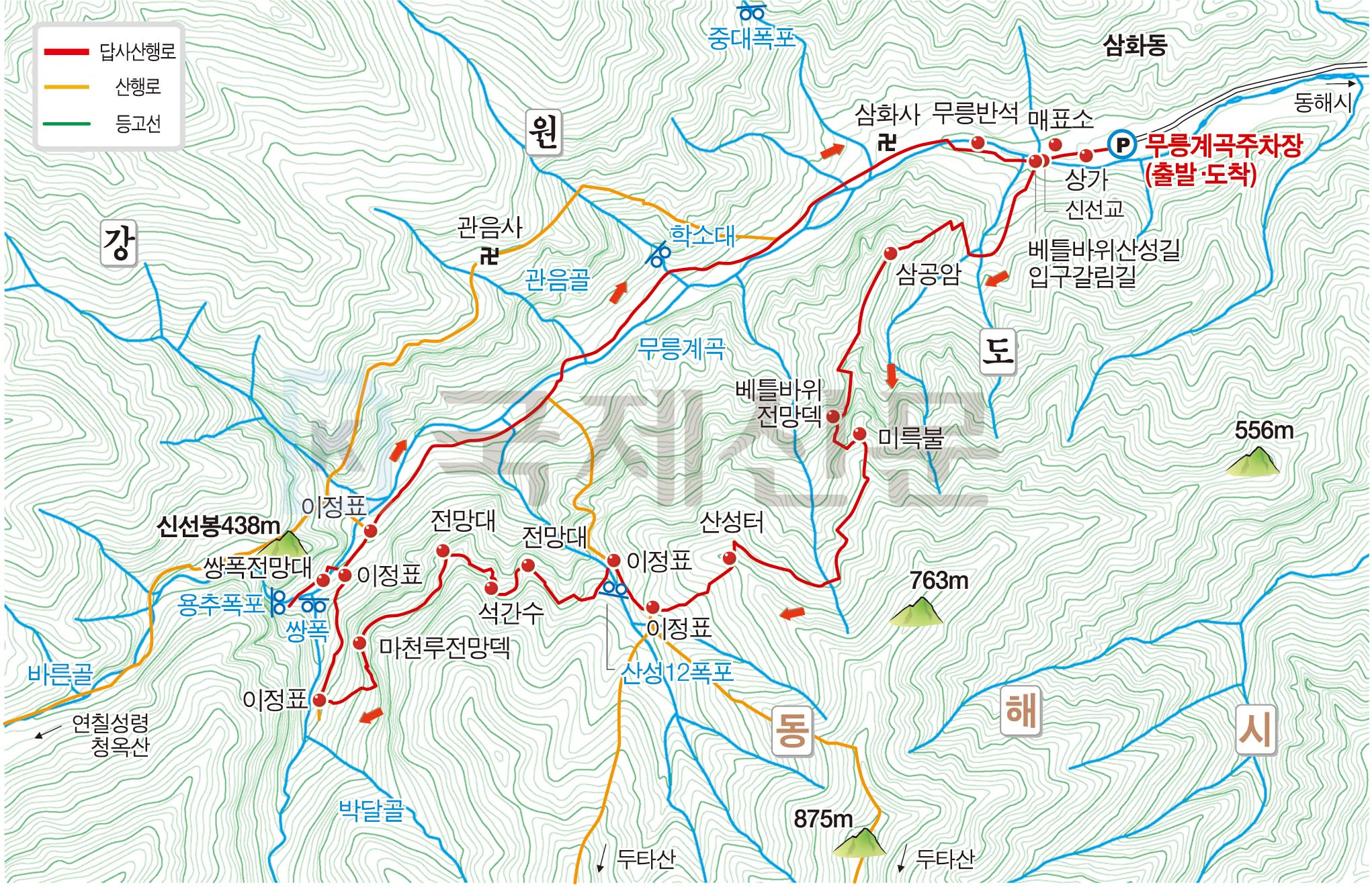[B코스] 대형주차장→매표소→베틀바위전망대→미륵바위→12산성폭포→두타산성→옥류동→학소대→무룡계곡→삼화사→대형주차장 (약5.2km)