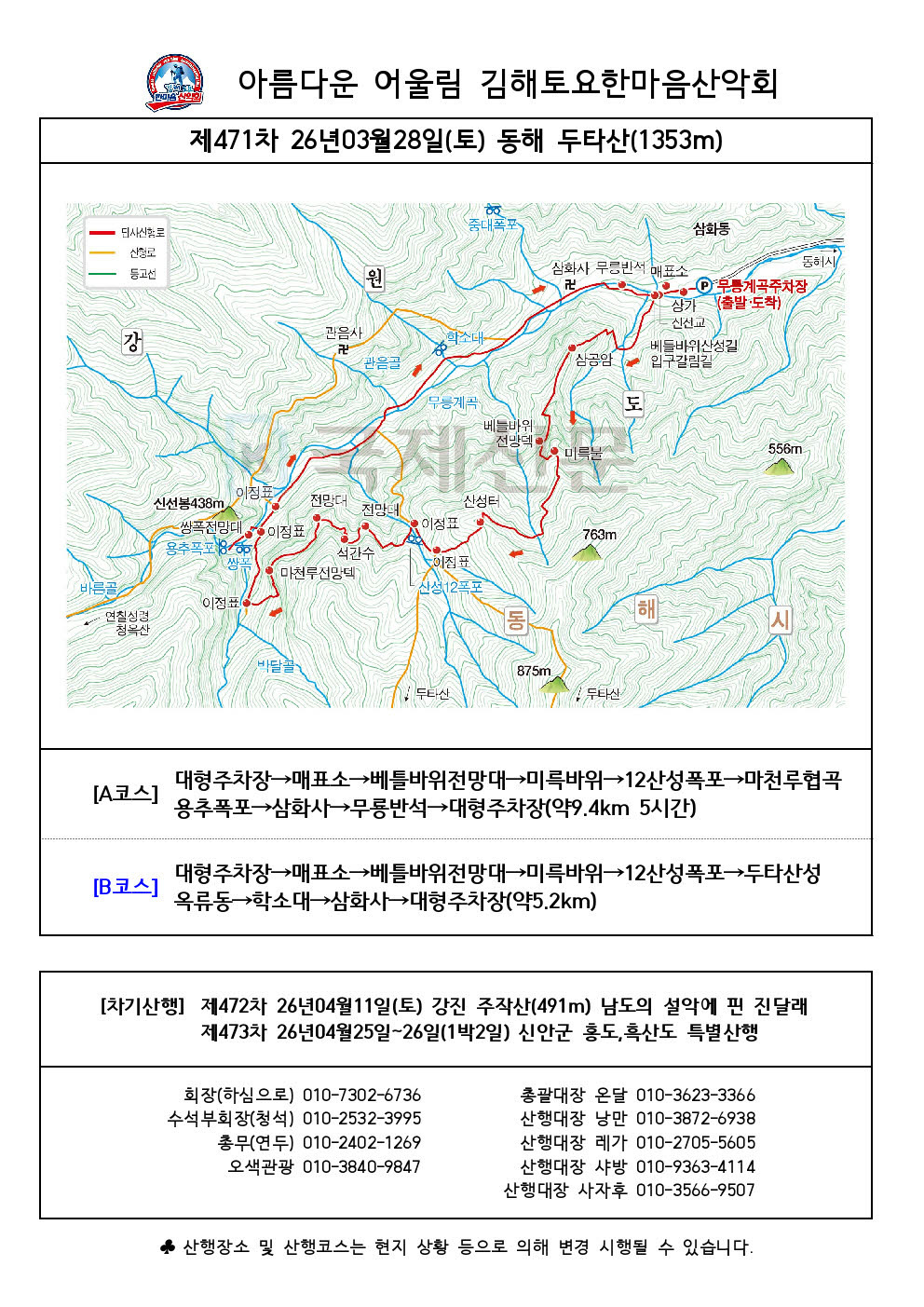제471차 26년03월28일(토) 동해 두타산(1353m) 배틀바위 조망산행