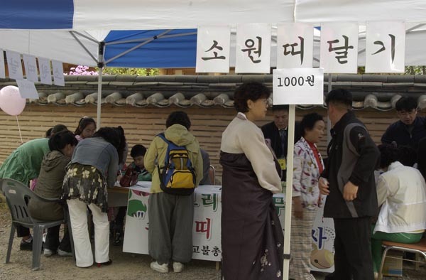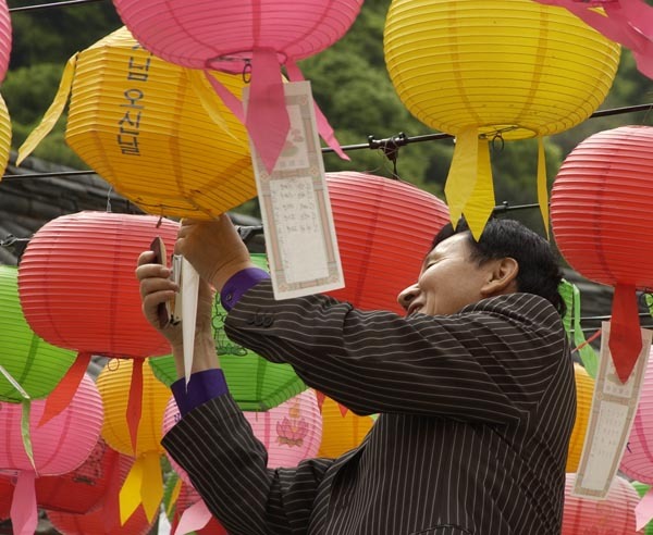 소원을 빌며 등을 달고 있어요.