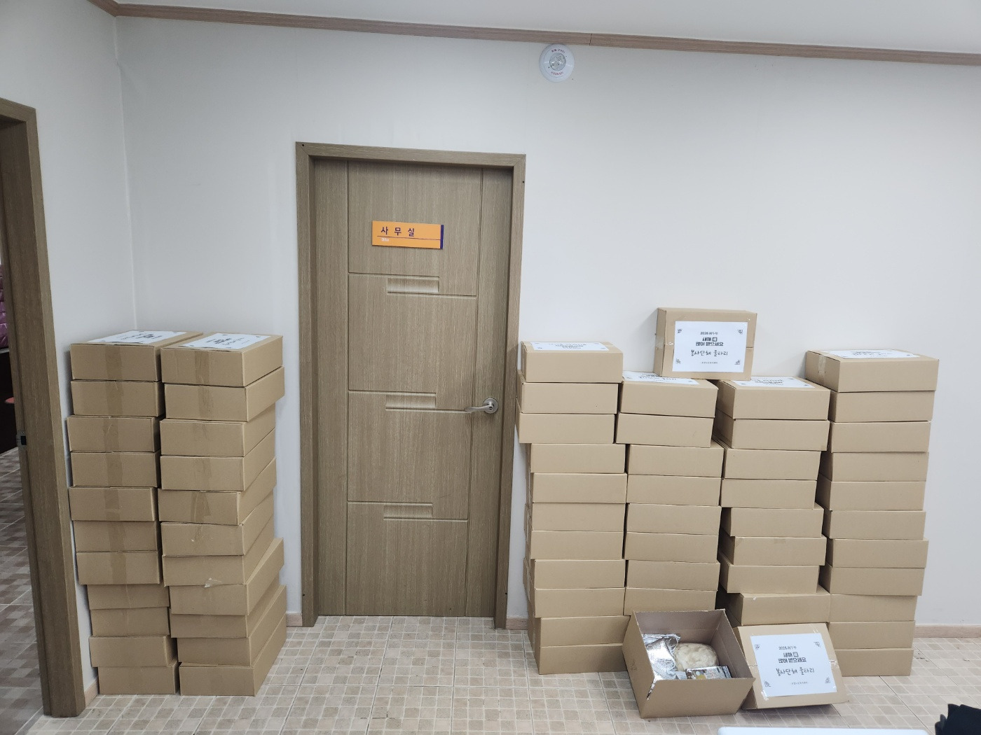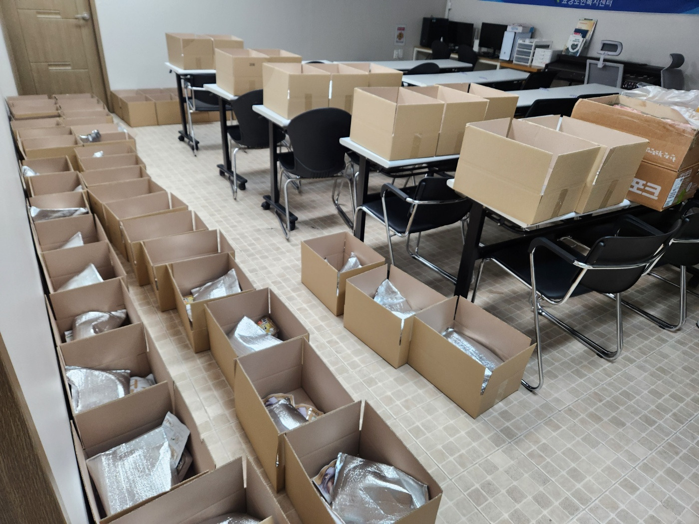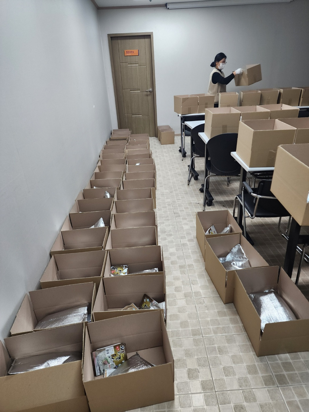 어르신들을 만나기 전에 열심히 선물꾸러미를 준비하는 중입니다~