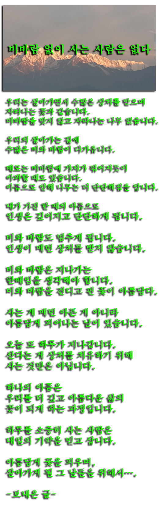 비바람 없이 사는 사람은 없다. 작성자初心|작성시간22.08.31|조회수18 목록 댓글 0 글자크기 작게가 글자크기 크게가 다음검색 현재 게시글 추가 기능 열기 북마크 공유하기 신고 센터로 신고 댓글 댓글 0 댓글쓰기 댓글 리스트