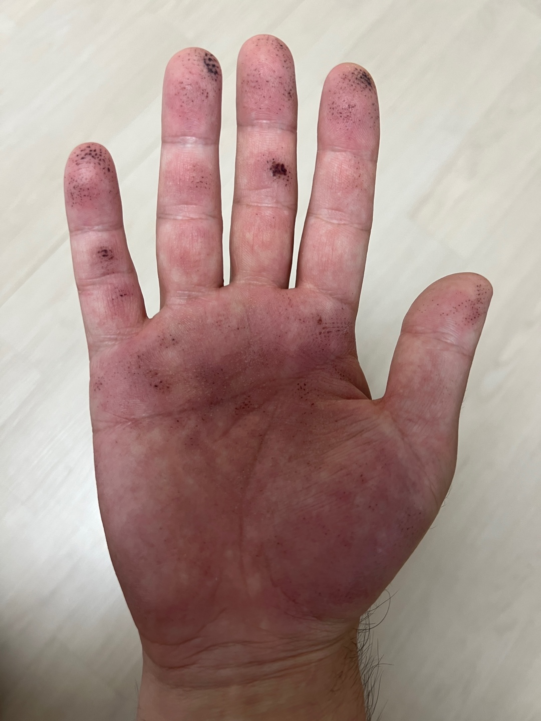오른손은 시술 일주일차인데 보시다시피 검붉은 자국이 많이 있습니다.