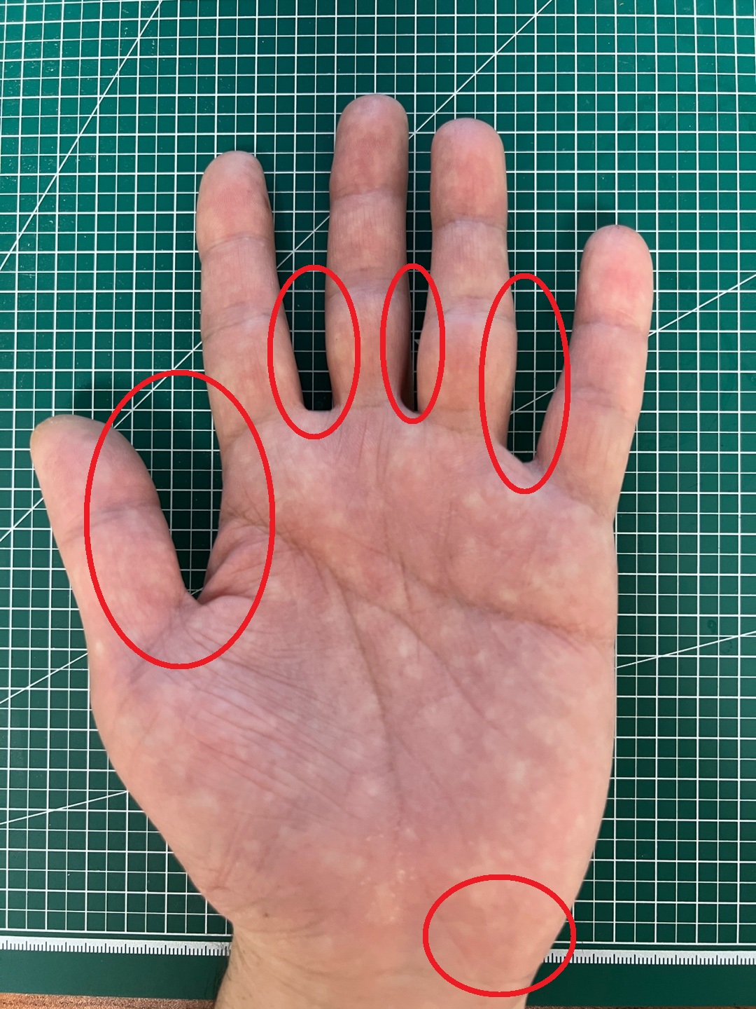 저의 경우에는 사진에 표시한 빨간 원 부분의 영역과 표시하지는 않았지만 손끝에서는 여전히 땀이 많이 납니다.