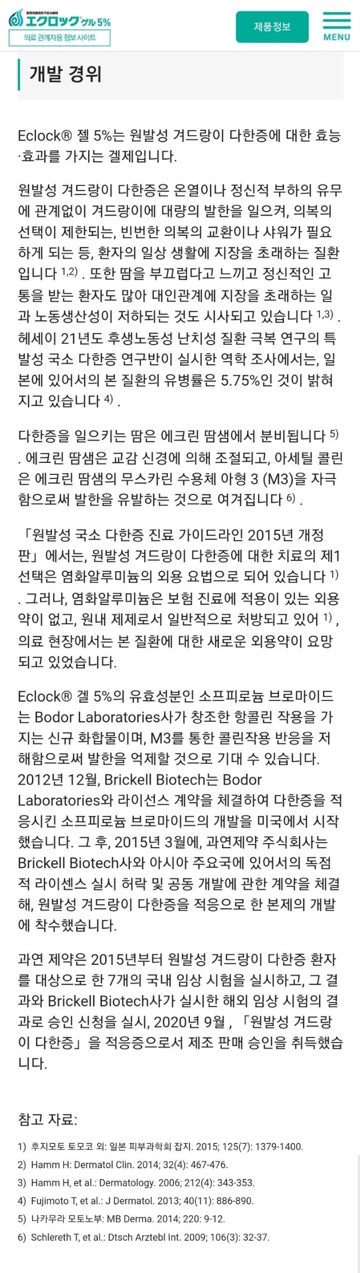 (일본) 바르는 다한증 약 Eclock : 5% 소피로늄 브로마이드 젤 작성자zoono|작성시간22.04.10|조회수923 목록 댓글 8 글자크기 작게가 글자크기 크게가 5% 소피로늄 브로마이드 젤일본 상품명 : Eclock출처https://ecclock.jp/医療関係者認証|エクロックゲル5%(原発性腋窩多汗症治療剤)|医療関係者向け情報サイト|여기를 눌러 링크를 확인하세요ecclock.jp해당 사이트 구글 번역 다음검색 현재 게시글 추가 기능 열기 북마크 공유하기 신고 센터로 신고 댓글 댓글 8 댓글쓰기 답글쓰기 댓글 리스트 답댓글 작성자zoono 작성자 본인 여부 작성자 | 작성시간 22.04.10 몸소 체험하심을.. 먼저 감사드립니다. 답댓글 작성자론리 | 작성시간 22.04.10 zoono 머리카락을 버리고, 다한증을 해결해볼까요. ㅎㅎ 작성자이찌 | 작성시간 22.04.12 드리클로와는 다른 방식인거죠?? 작성자보이소 | 작성시간 22.04.14 얼굴땀? 작성자박영규 | 작성시간 22.04.16 두한증 치료가 됐으면 합니다머리에서 땀이 넘 나서 ~~누가 머리에 바르고 후기좀 부탁 합니다 댓글 전체보기
