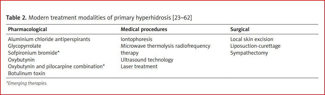 Hyperhidrosis is a disorder of sweat glands characterized by overproduction of sweat, which is inadequate to the thermoregulatory needs of the body system. Owing to the heavy social and economic burden of the disproportionate perspiration, current treatment methods still do not seem to be sufficient enough to reach patients' expectations. Therefore, the researchers continue a robust pursuit of novel therapy modalities such as topical treatment methods, oral agents, minimally-invasive medical approach and surgical techniques. In this review article authors summarise the disease outline with the emphasis on the new era of hyperhidrosis treatment methods.