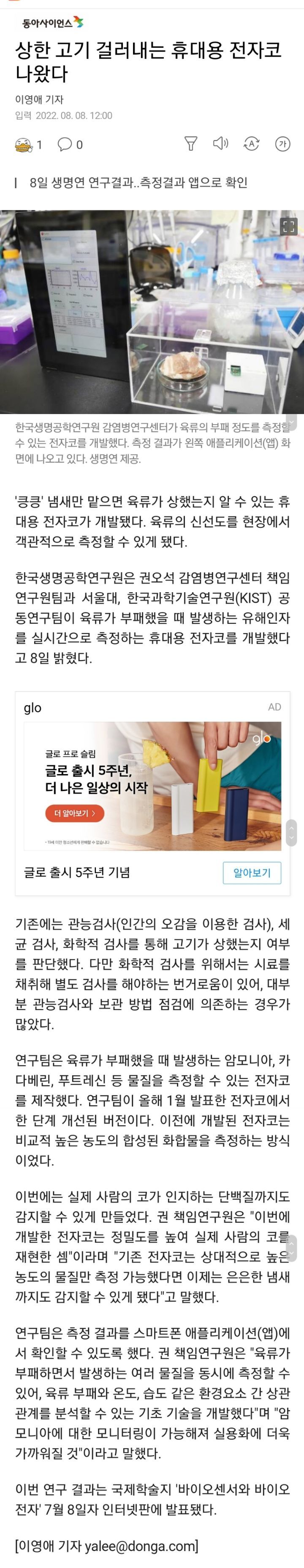 (기사) 상한 고기 걸러내는 휴대용 전자코 나왔다 작성자zoono|작성시간22.08.08|조회수100 목록 댓글 0 글자크기 작게가 글자크기 크게가 https://news.v.daum.net/v/20220808120019940상한 고기 걸러내는 휴대용 전자코 나왔다'킁킁' 냄새만 맡으면 육류가 상했는지 알 수 있는 휴대용 전자코가 개발됐다. 육류의 신선도를 현장에서 객관적으로 측정할 수 있게 됐다. 한국생명공학연구원은 권오석 감염병연구센터 책임news.v.daum.net 다음검색 현재 게시글 추가 기능 열기 북마크 공유하기 신고 센터로 신고 댓글 댓글 0 댓글쓰기 답글쓰기 댓글 리스트