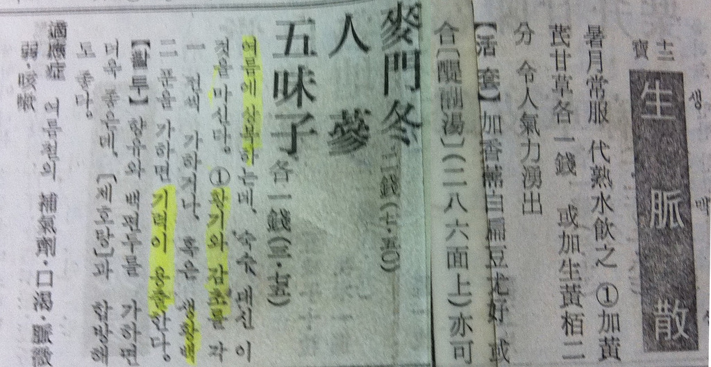 아래의 사진은 生脈散에 대한 내용을 경동시장에서 책자를 촬영한 사진입니다.