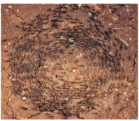 선두 개미가 어떠한 이유로 길을 잃고 원을 그리기 시작하면 다른 개미들이 그를 따라오기 시작함.