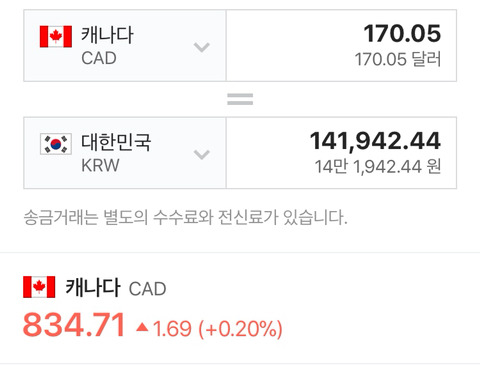 캐나다 달러를 바꾸면 141.942원이 나오구요