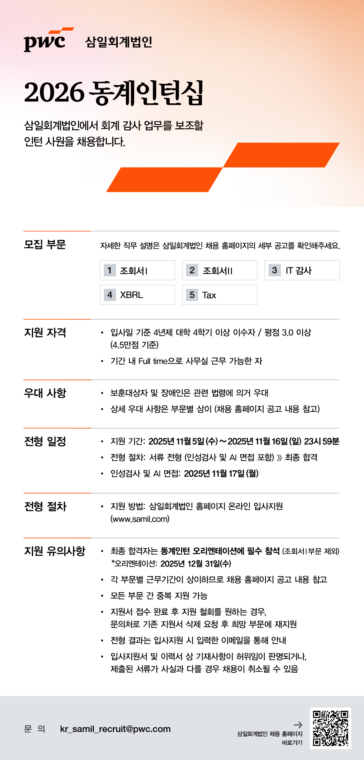 삼일회계법인 채용 홈페이지 링크: https://www.pwc.com/kr/ko/career/2026-internship.html