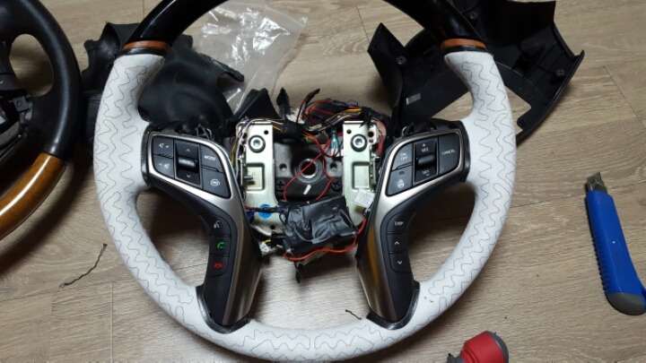 먼저 hg열선핸들속 핸들열선패드를 조심히 탈거해서 티지 순정핸들과 hg열선패드를 서울에 핸들가죽장인께 의뢰해서 택배로 보내서 작업햇숩니다(공임10택비따로)(여기핸들가죽사장님께서 작업많이막않하신다고 연락처공유는 꺼려하시는거같앗숩니다)