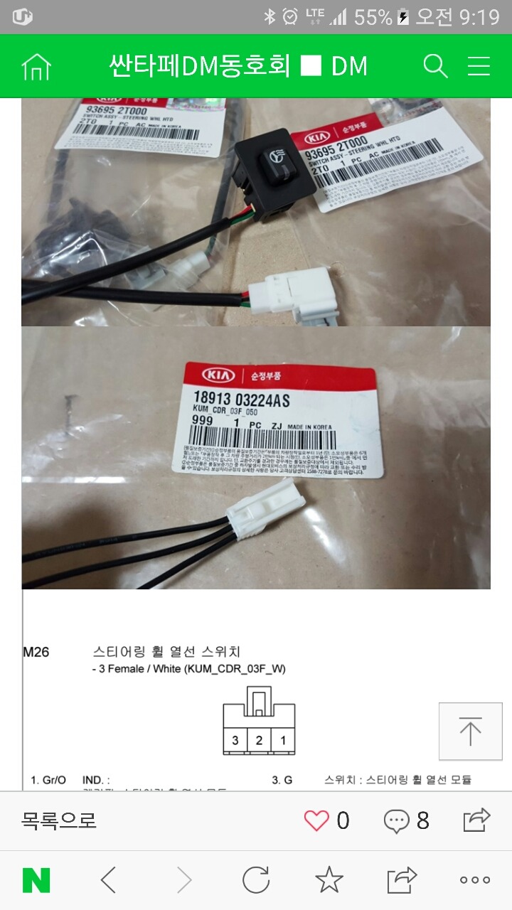 모듈기판에서 컨넥터가 2개나오는데 한쪽은 열선핸들패드쪽 컨넥터와 연결하고 나머지한쪽은 플러스마이너스 작동확인등 작동신호등입니다