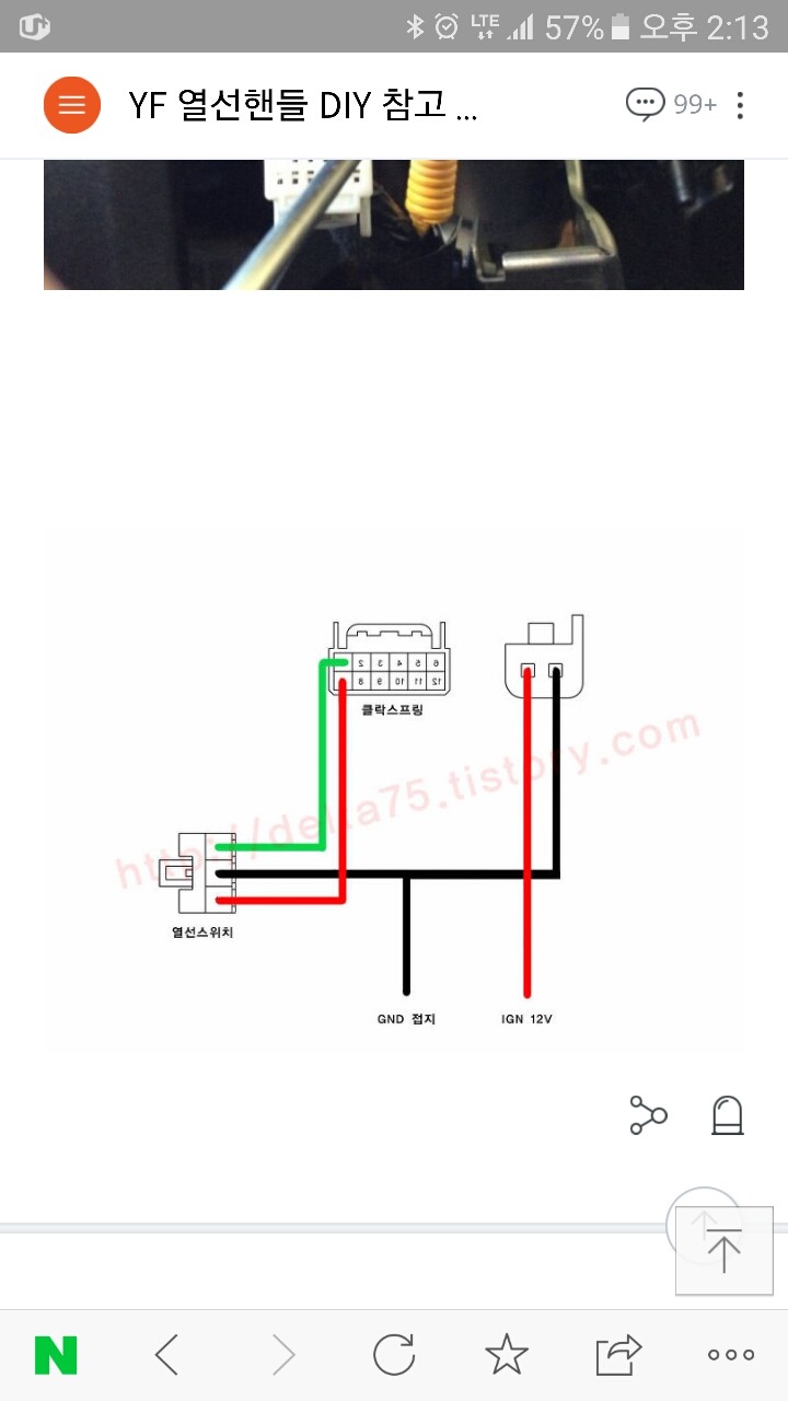 티지클럭스프링의 에어백2개 배선에 휴즈박스 보조휴즈에서 끌어와서 플러스연결해와서 티지클럭스프링 에어백배선2개로 열선 플러스선 연결햇구요