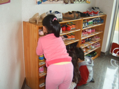 "보물 찾았다" 보물용지를 찾은 유아들은 크게 외쳤습니다 여긴 신발장에서 신발속을 뒤지고 있어요