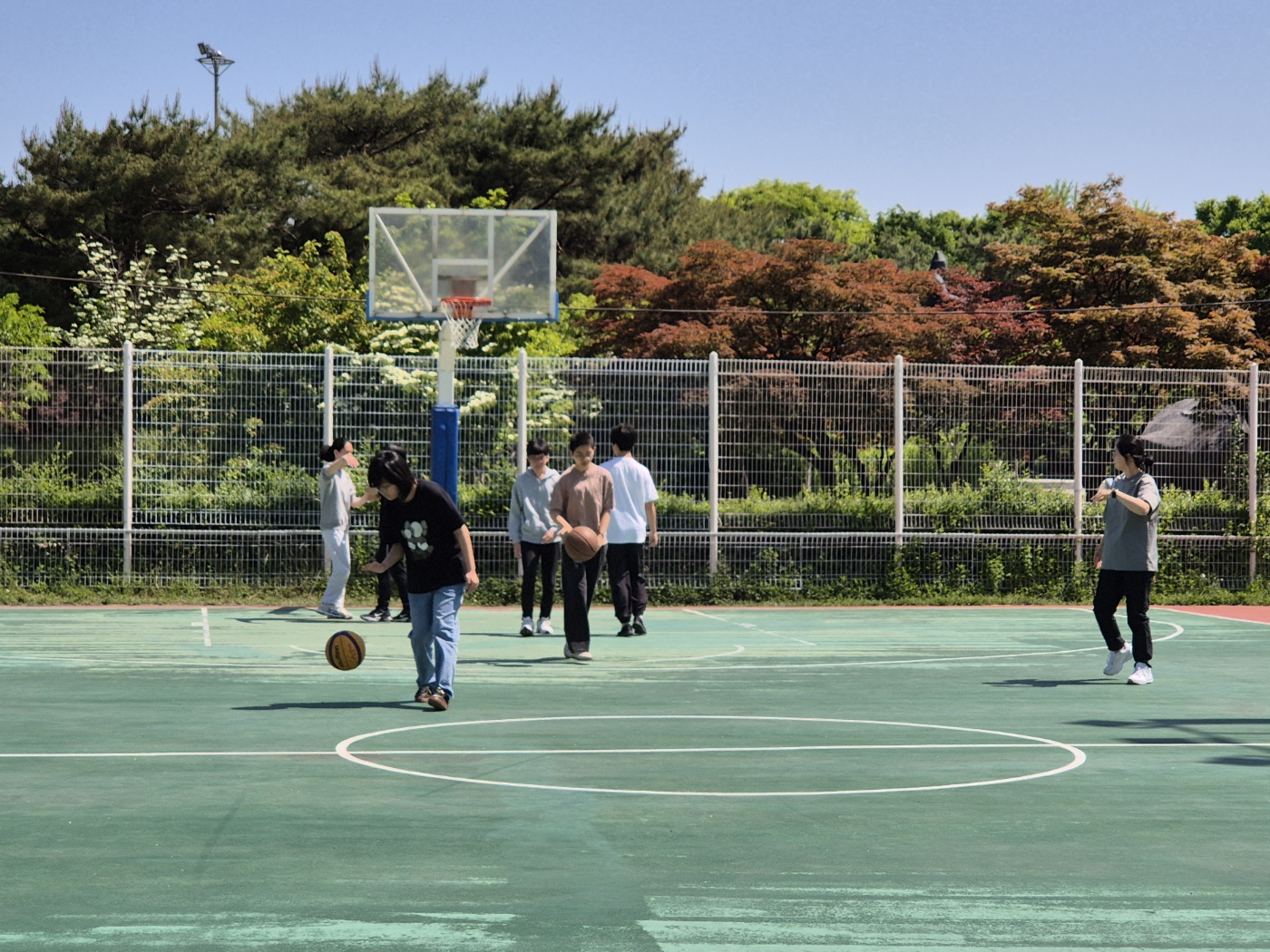 우리 학교 운동장처럼 사용하고 있는 공지천 농구장에서의 체육 수업입니다.