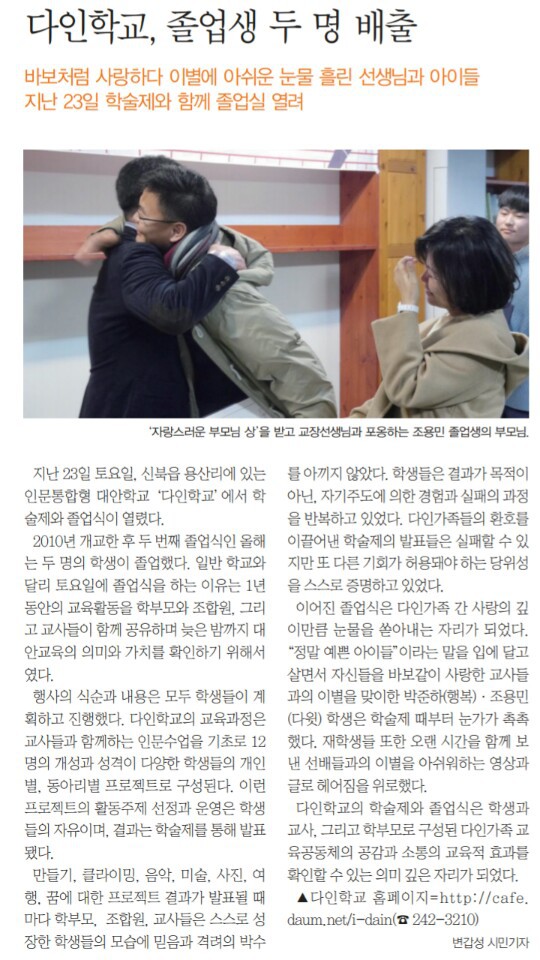 2017 다인학교 학술제 및 졸업식 관련 기사예요~^^ 작성자진명(권경훈)|작성시간17.12.31|조회수162 목록 댓글 0 글자크기 작게가 글자크기 크게가 "춘천사람들" 107호에 실린 기사 첨부합니다^^ 다음검색 현재 게시글 추가 기능 열기 북마크 신고 센터로 신고 댓글 댓글 0 댓글쓰기 댓글 리스트