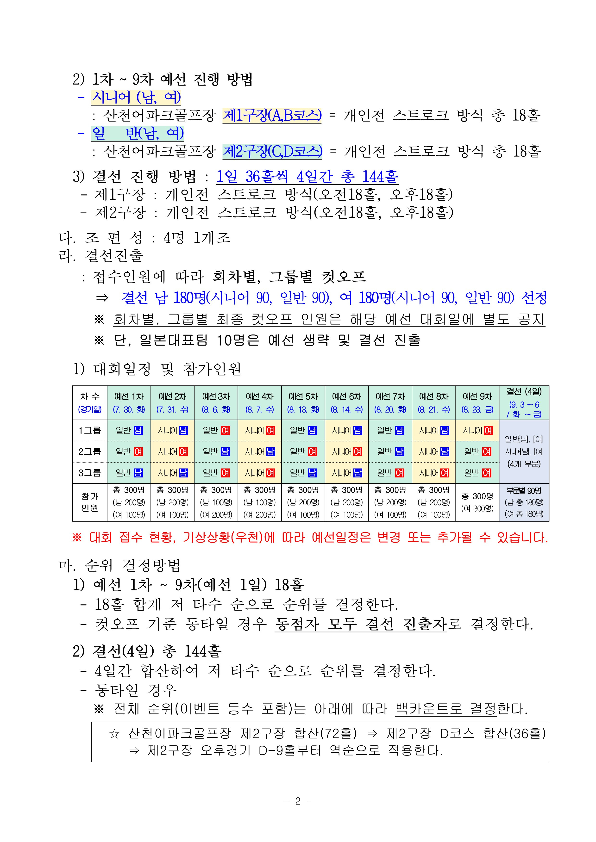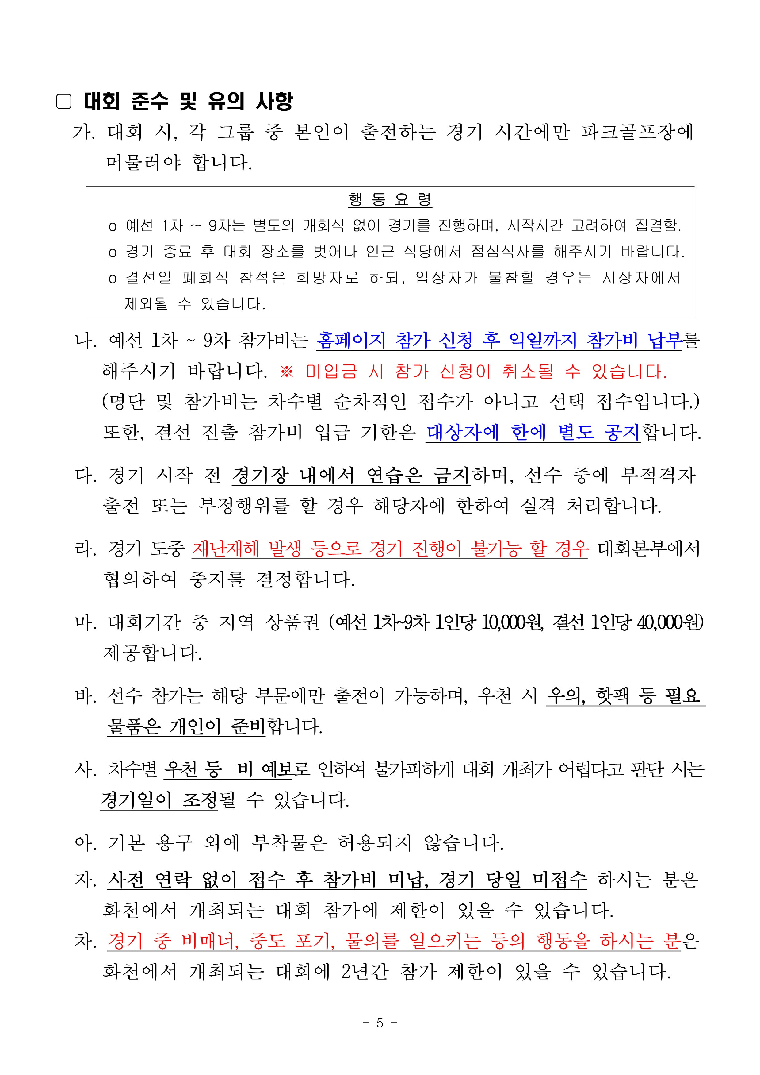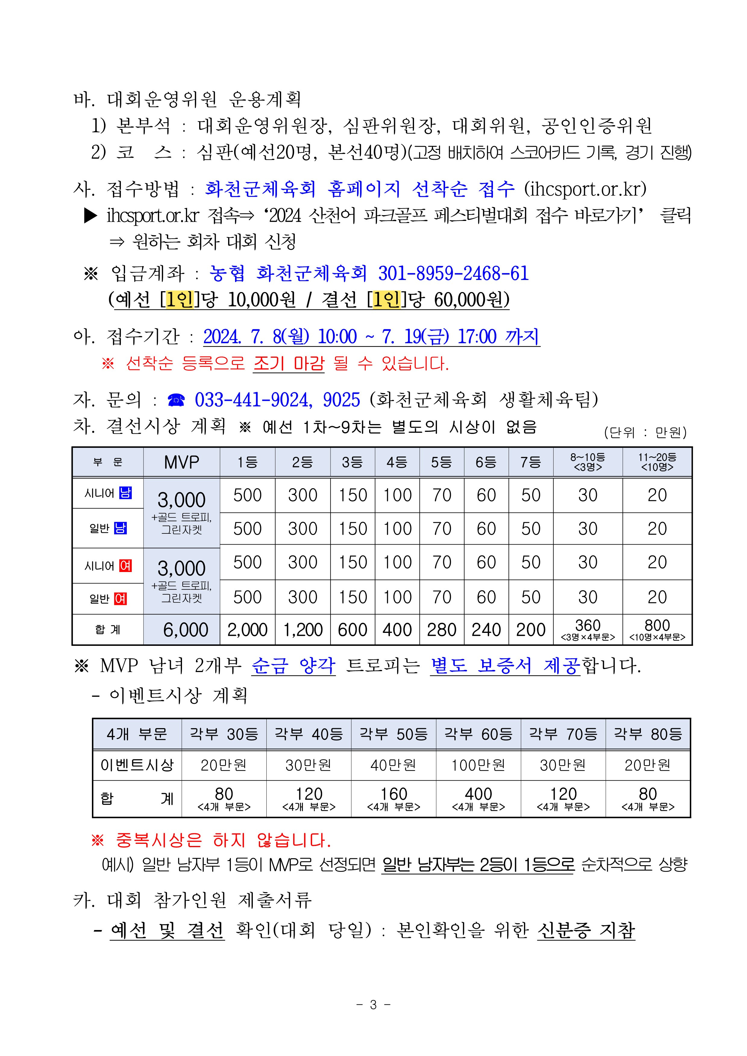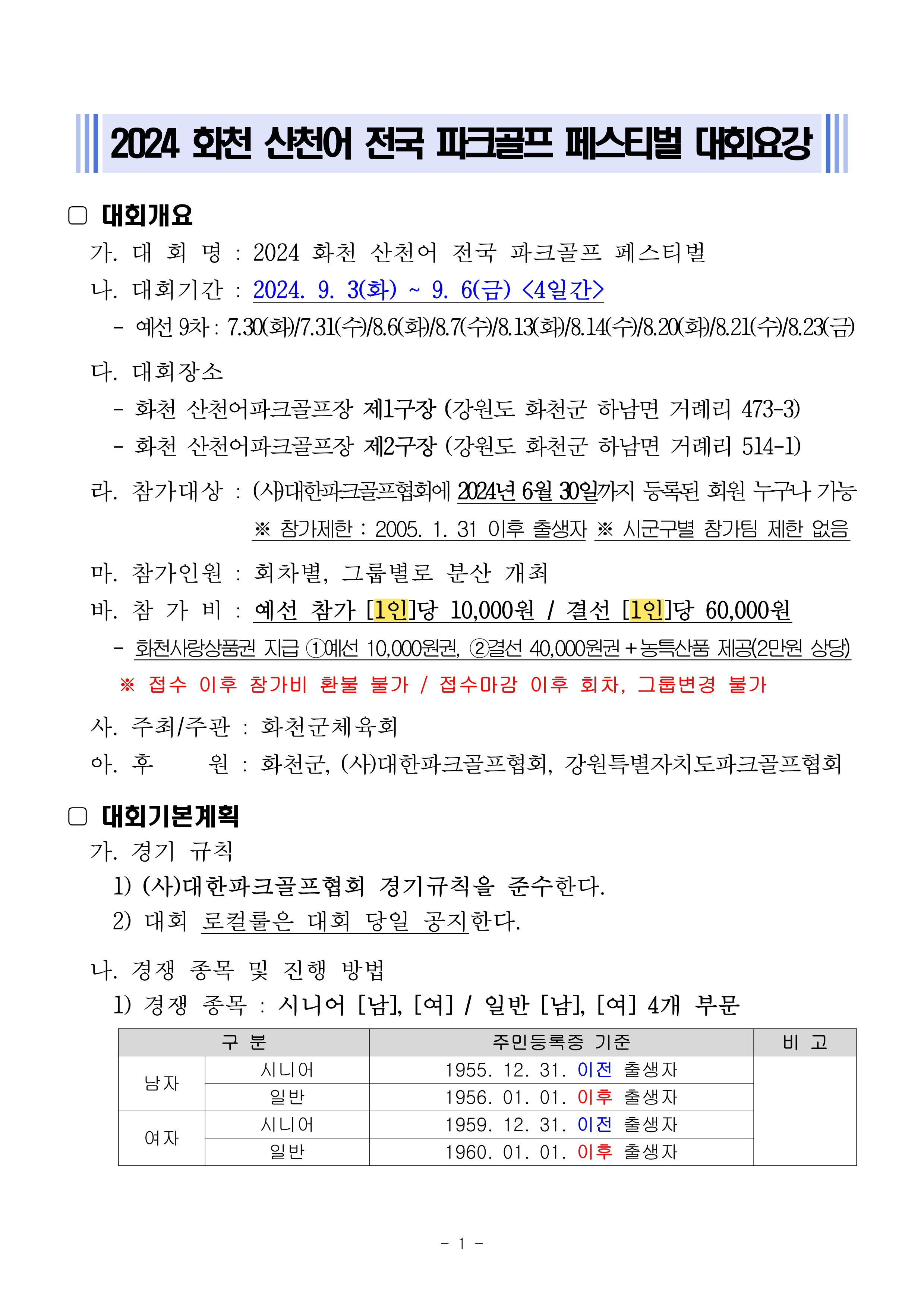 2024 화천 산천어 전국파크골프 페스티벌 대회요강 작성자황수연(홍보위원장)|작성시간24.08.07|조회수60 목록 댓글 0 글자크기 작게가 글자크기 크게가 다음검색 현재 게시글 추가 기능 열기 북마크 공유하기 신고 센터로 신고 댓글 댓글 0 댓글쓰기 답글쓰기 댓글 리스트